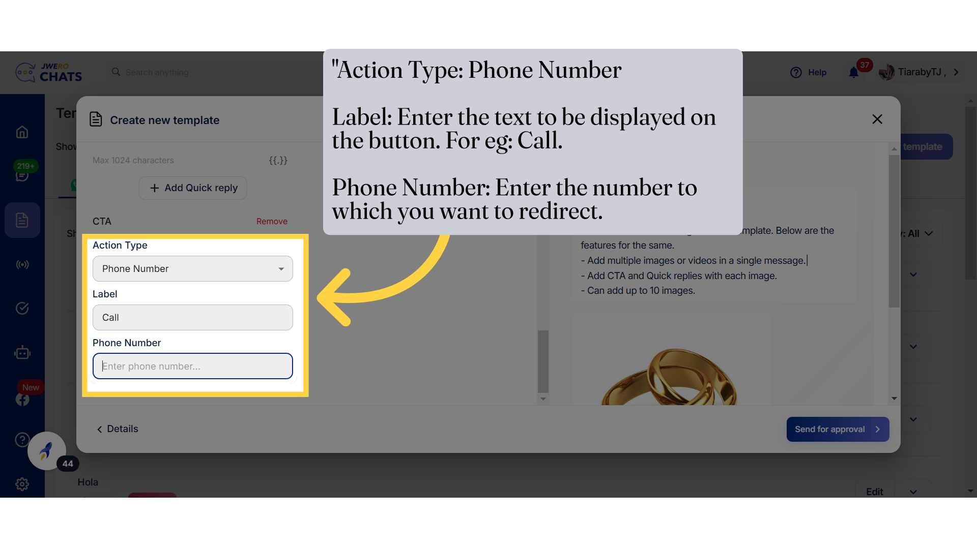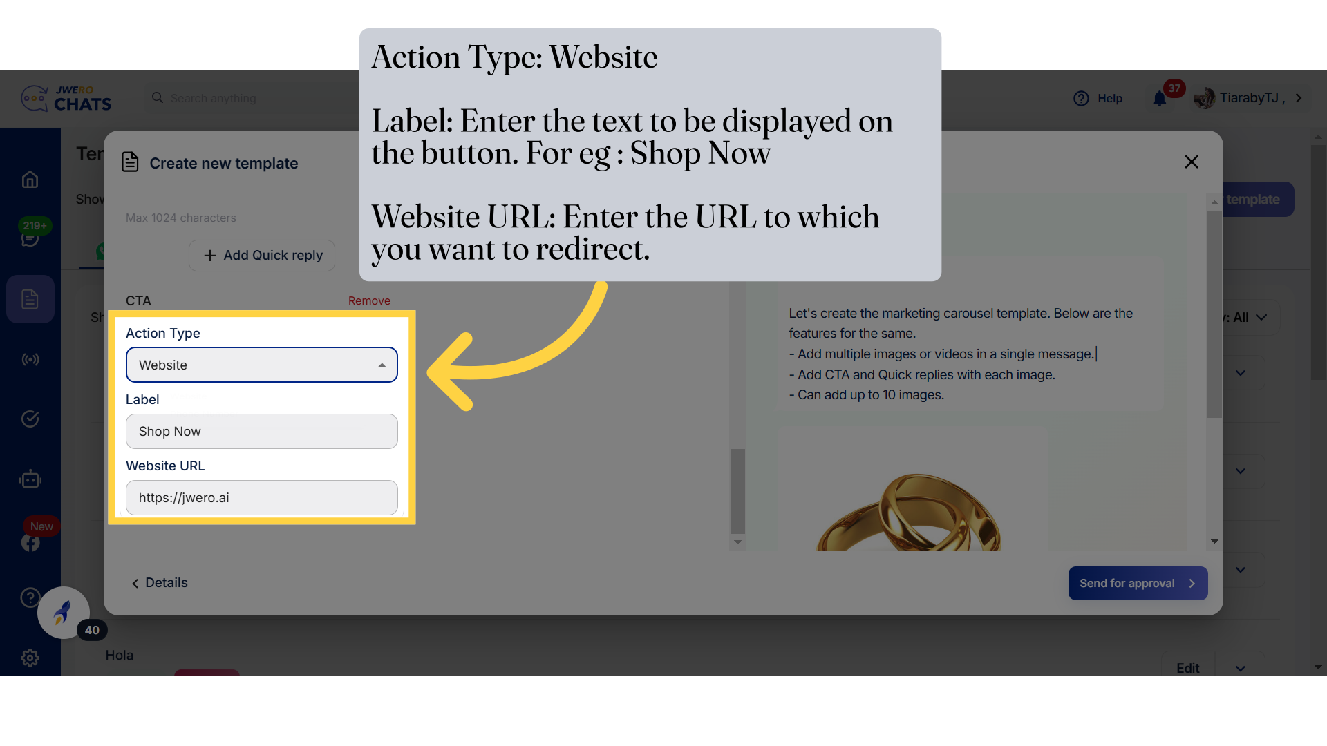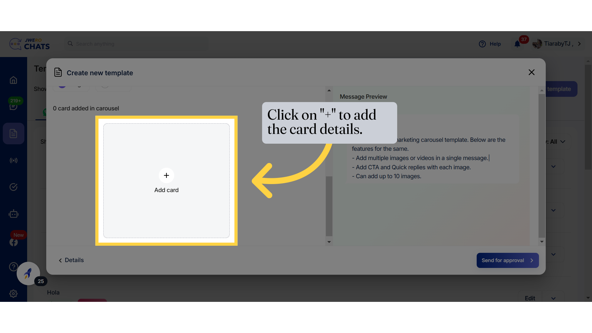 Note: Adding text content in the body is mandatory, along with at least one CTA or quick reply.