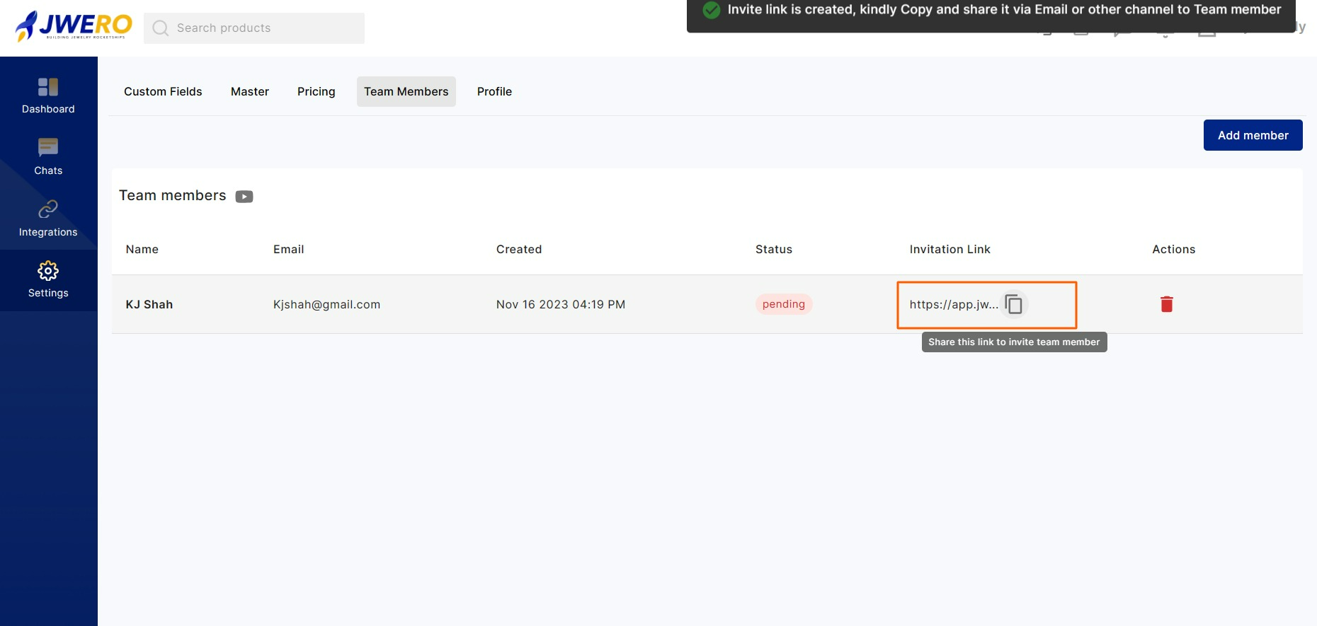Copy Invitation Link in Incognito and Create Password for your team member and share.