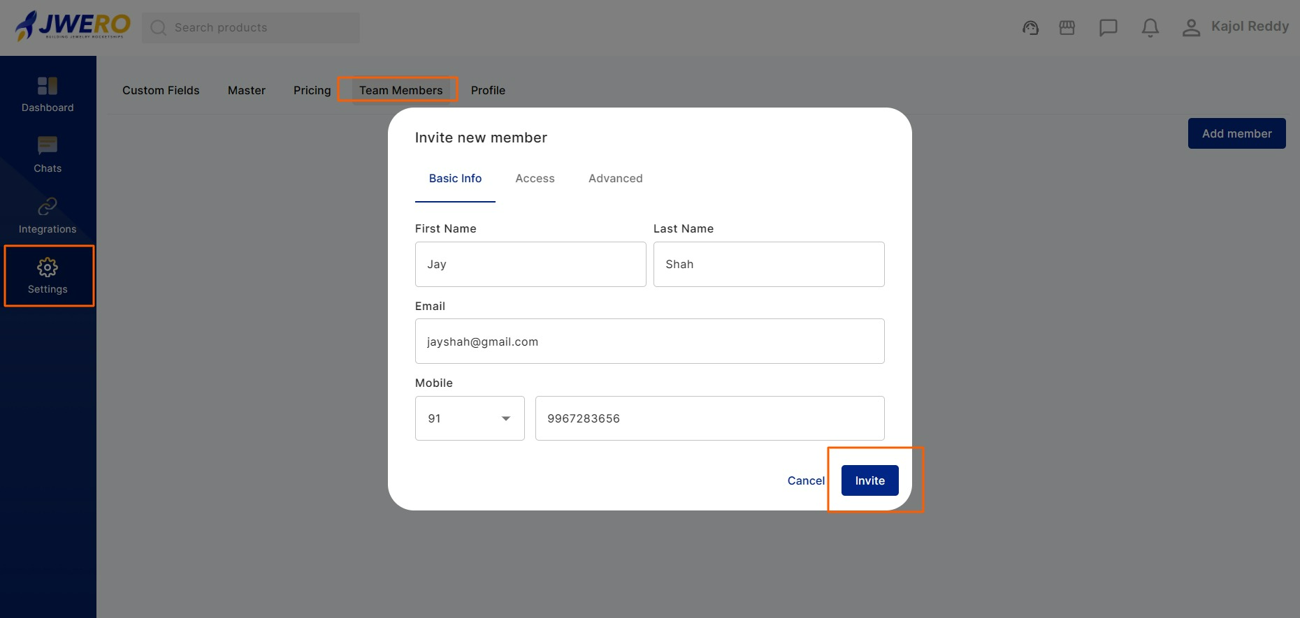 Go to Settings > Team Member >> Add new Team Member >> Add Name + Number + Email >> Manage Access >> Invite.
